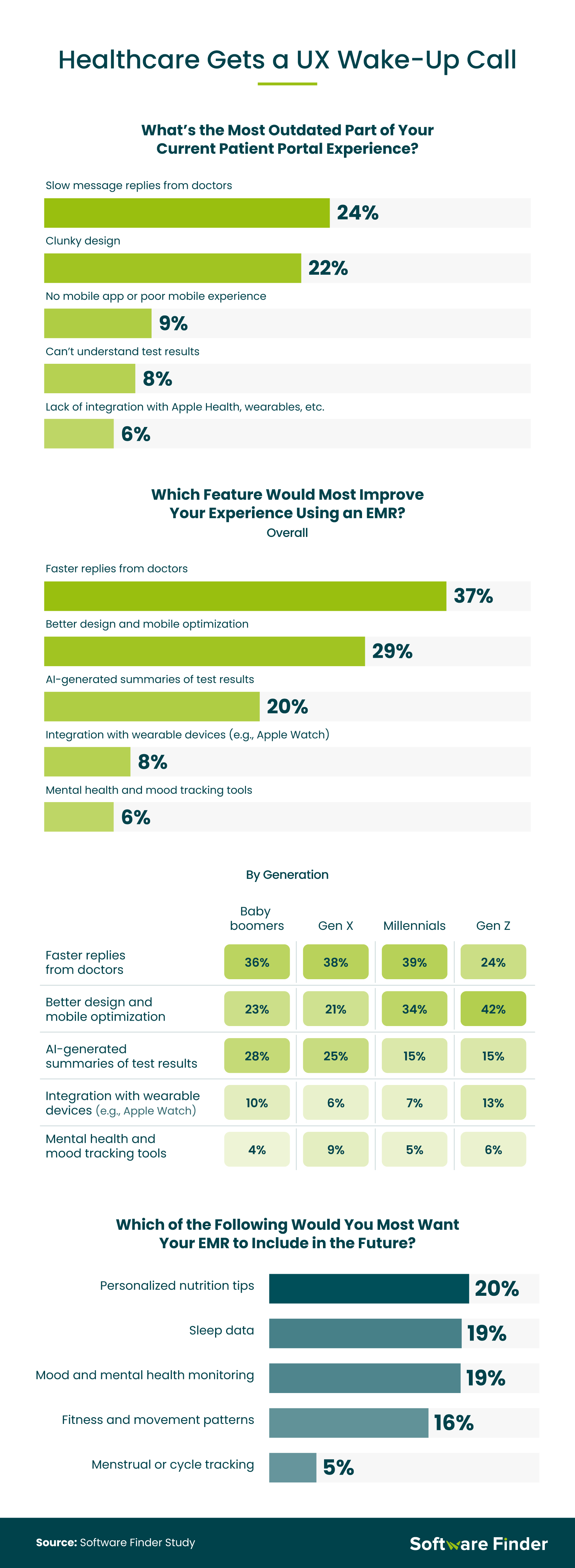 Software Finder surveyed 956 U.S. adults to understand their experiences with electronic medical records (EMRs). Respondents were segmented by generation as follows: baby boomers (14%), Gen X (30%), millennials (42%), and Gen Z (13%). The survey measured attitudes toward EMR usability, trust in digital tools, and preferences for healthcare features.