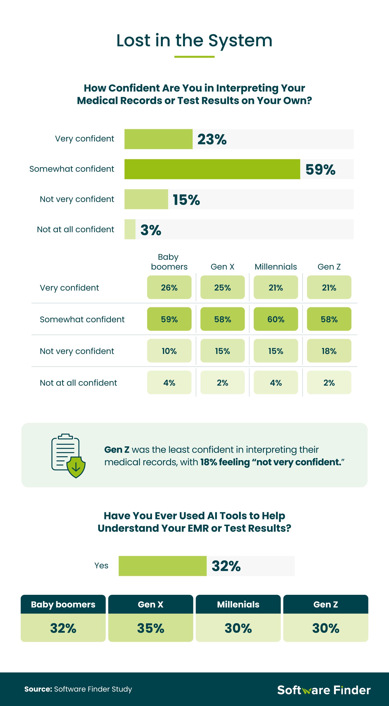 Overall, 59% of all patients said they were only "somewhat confident" in interpreting their EMR or test results. To bridge this gap, 32% of patients have turned to AI tools or digital assistants to help them understand their records. Gen X has done so the most often, at 35%.